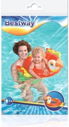 Kształt koła z przestronnym siedziskiem stabilnie utrzymuje dziecko na powierzchni i dodaje pewności podczas oswajania z wodą.