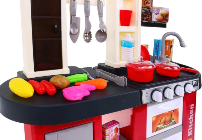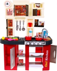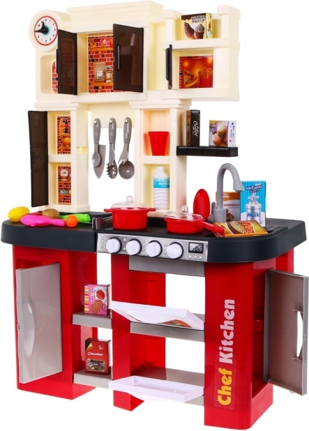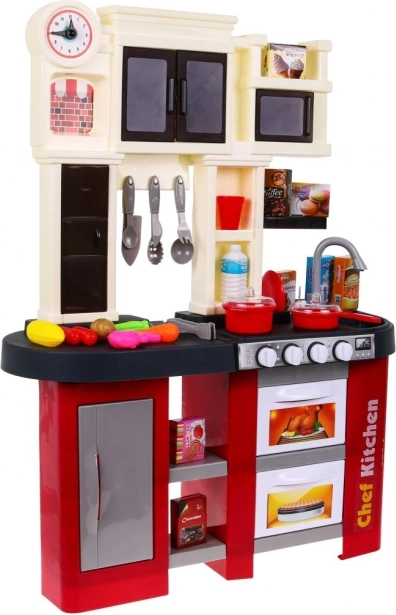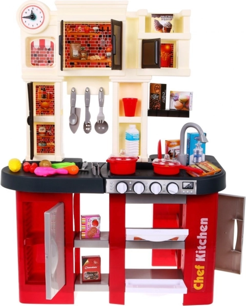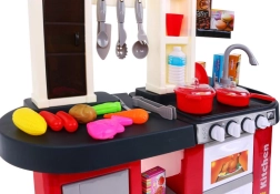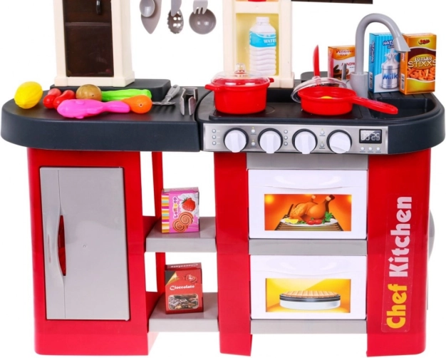 Ta przestronna plastikowa kuchnia w czerwono‑czarnym stylu zapewnia dzieciom od 3 lat autentyczne wrażenia z gotowania. Realistyczne efekty świetlne i dźwięki gotowania oraz smażenia po przekręceniu pokręteł wspierają kreatywną zabawę i rozwój motoryki. W zestawie znajduje się także działający kran, który wynosi zabawę na kolejny poziom.