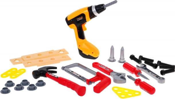 Kompletny dziecięcy zestaw dla małych majsterkowiczów od 3 lat oferuje 26 elementów do realistycznej zabawy w naprawianie. W zestawie znajduje się interaktywna wkrętarko-wiertarka na baterie, klucze, młotek, śrubokręty, piłka, śrubki i elementy łączące. Dzięki wiernemu wzornictwu oraz dźwiękom podczas wkręcania rozwija małą motorykę, kreatywność i umiejętności techniczne dzieci.