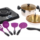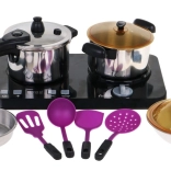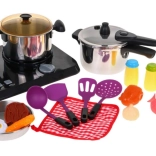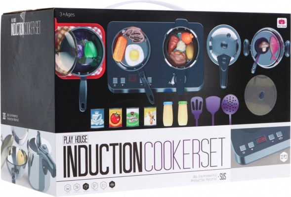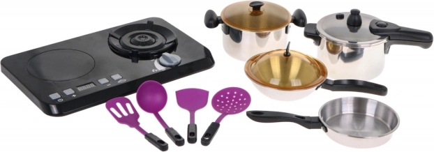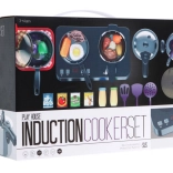 | Wspaniały, świetnie wyposażony zestaw kuchenny składający się z płyty indukcyjnej, garnków i akcesoriów do gotowania, przeznaczony dla dzieci od trzeciego roku życia. Patelnia, garnek i szybkowar wyglądają jak prawdziwe, ale w miniaturowej wersji. Płyta indukcyjna zasilana jest 3 bateriami AA 1,5 V (brak w zestawie) i wyposażona w efekty dźwiękowe oraz świetlne. Po lewej stronie znajduje się podświetlany palnik z odgłosami gotowania oraz panel do zmiany czasu gotowania od 2 do 20 minut. Po prawej znajduje się podświetlany palnik z odgłosami smażenia i przyciskiem włącz/wyłącz. W zestawie znajdują się również atrapy produktów spożywczych. | ||