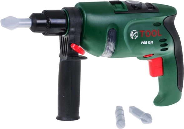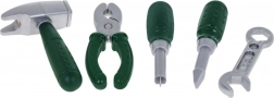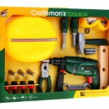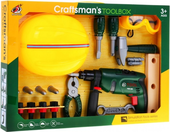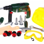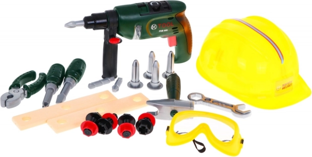 | | Zestaw dla majsterkowicza z wiertarką, goglami, kaskiem i narzędziami jest odpowiedni dla dzieci od 3 lat. Zabawka pozytywnie wpływa na rozwój myślenia logicznego, pobudza kreatywność i wspiera koordynację ręka-oko. Wkrętak zasilany jest bateriami typu 2 x AA 1,5 V – nie są dołączone do zestawu. | Zawartość zestawu |