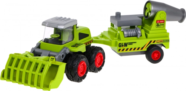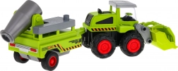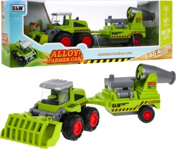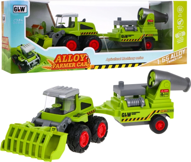 Metalowy rolniczy ładowacz z przyczepą to idealna zabawka dla małych farmerów w wieku powyżej trzech lat. Zabawka zawiera ruchomą metalową łyżkę i odłączaną przyczepę z opryskiwaczem, gumowe koła oraz napęd tylnej osi.