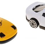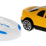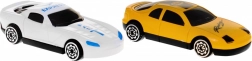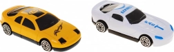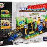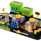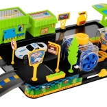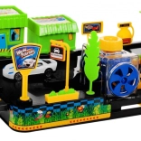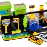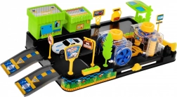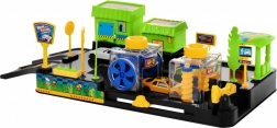 W opakowaniu znajdziesz 2 autka, rampy, szlabany, znaki i dekoracje, w tym stację paliw oraz market/restaurację.