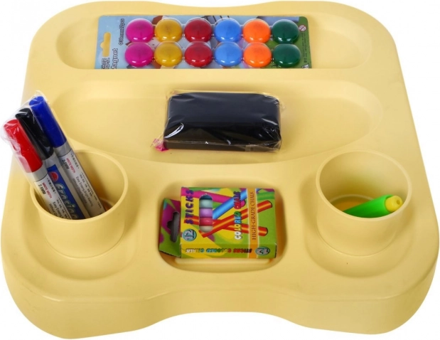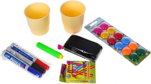W zestawie znajdują się plastikowe kubeczki, zestaw markerów, kred, magnesów oraz uchwyt na kredy, które wspierają wszelkie rodzaje aktywności artystycznych.
