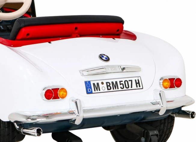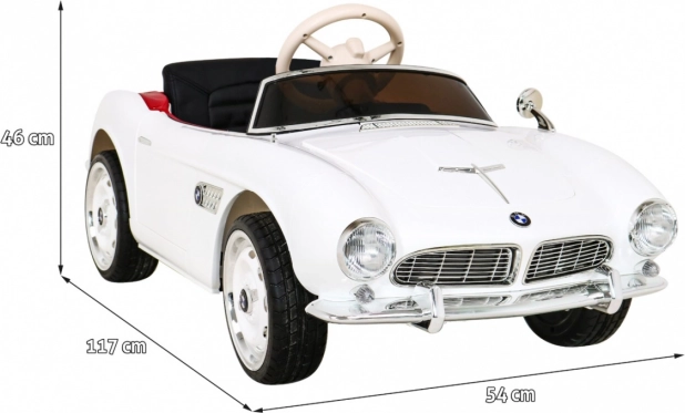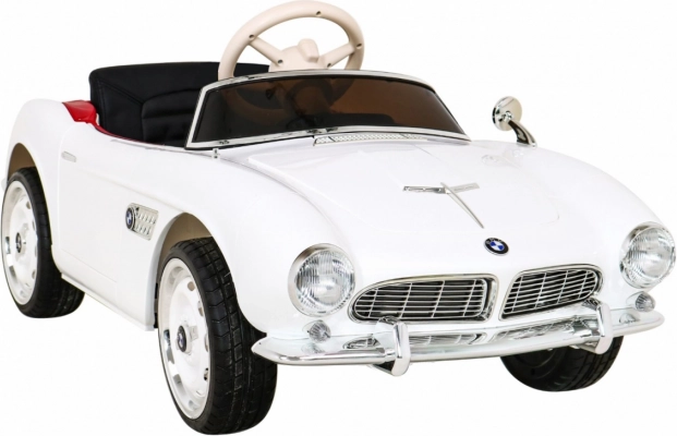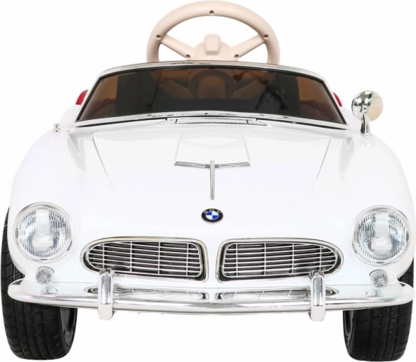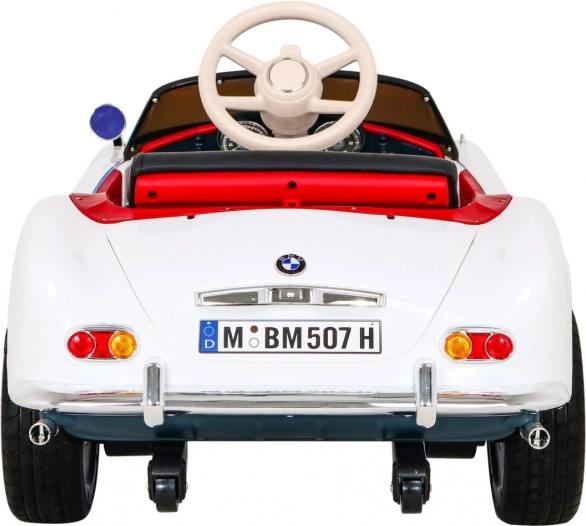 Elektryczne autko BMW 507 retro w białym kolorze łączy ikoniczny design z praktycznością na co dzień. Dzieci zachwyci autentyczna kratka, chromowane dodatki oraz otwierane drzwi, które zwiększają realizm wrażeń. Wygodne siedzisko z czarnej wentylowanej eko-skóry z pasem bezpieczeństwa oraz reflektorami LED dba o styl i bezpieczeństwo podczas jazdy. Maksymalne obciążenie to 30 kg, wymiary pojazdu 117 × 54 × 46 cm.
