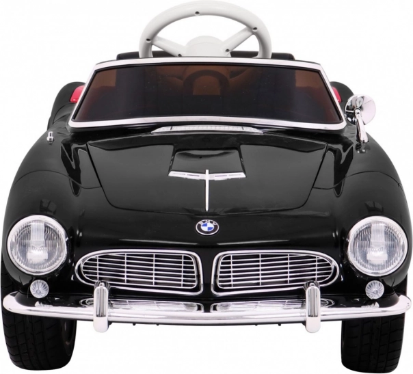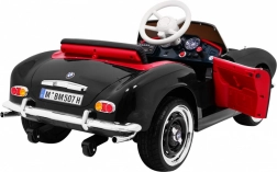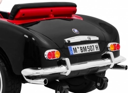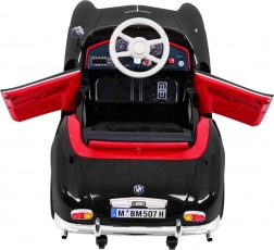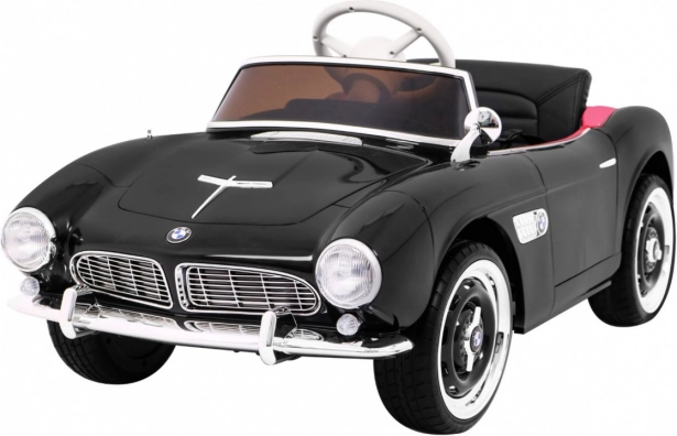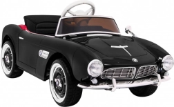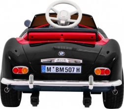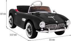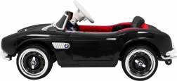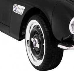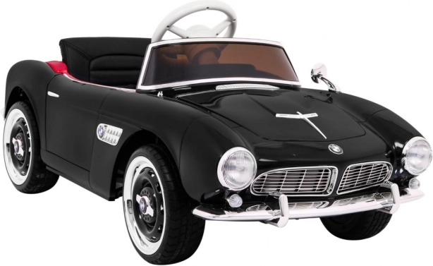 Czarny dziecięcy roadster inspirowany klasycznym BMW 507 zachwyca eleganckimi chromowanymi detalami, wiernym grillem i precyzyjnie zaprojektowanym kokpitem. Miękkie, wentylowane siedzisko z ekoskóry z pasem bezpieczeństwa oraz płynny soft start zapewniają wygodę i pewność podczas każdej jazdy. Praktyczne otwierane drzwi ułatwiają wsiadanie i wysiadanie.
