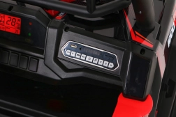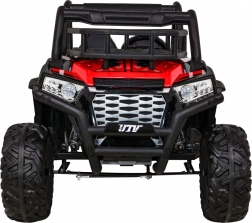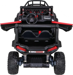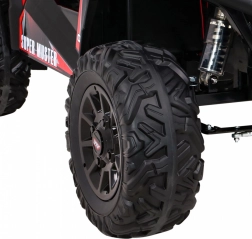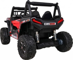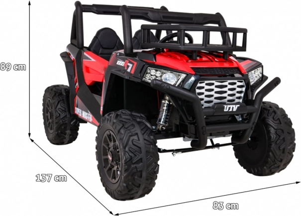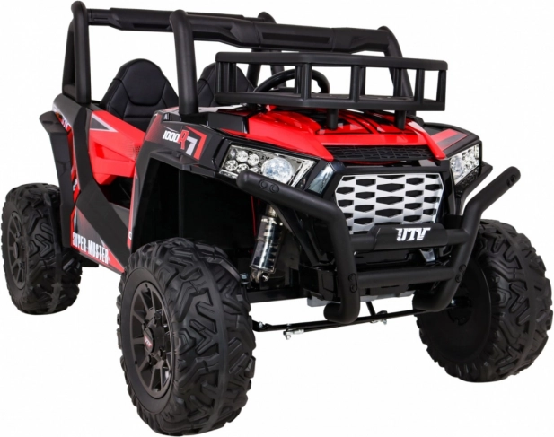 Wyrusz z dziećmi w teren z wydajnym buggy UTV 24 V w atrakcyjnej czerwieni. Dwa silniki 2×200 W, duże koła EVA 34×15 cm oraz czteropunktowe zawieszenie (2× przód, 2× tył) z regulowanymi amortyzatorami poradzą sobie z nierównościami, krawężnikami i ogrodowymi ścieżkami. Płynny start bez szarpnięć chroni małych pasażerów, a oświetlenie LED z przodu i z tyłu zapewnia widoczność.
