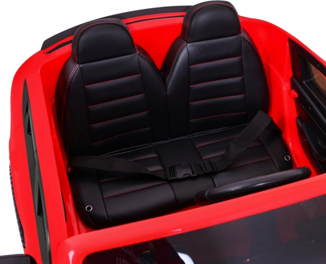 Fotel z czarnej, wentylowanej eko skóry z pasami bezpieczeństwa zapewnia wygodę, a zdalne sterowanie 2.4 GHz z 3 prędkościami i przyciskiem Stop daje rodzicom pełną kontrolę.