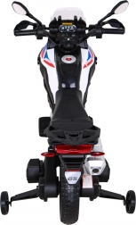 Stylowy dziecięcy motocykl na baterię inspirowany modelem BMW F850 GS oferuje realistyczny wygląd, bezpieczne kółka pomocnicze, wygodny miękki start i ciche koła EVA. Dzięki 2 silnikom 35 W, przednim światłom LED oraz panelowi audio z USB/AUX dzieci cieszą się bezpieczną i pełną zabawy jazdą w domu i na zewnątrz.