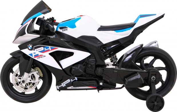 Dziecięcy motocykl elektryczny BMW HP4, biały, kółka pomocnicze, łagodny start, koła EVA, MP3 i LED
