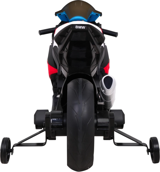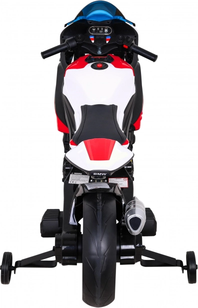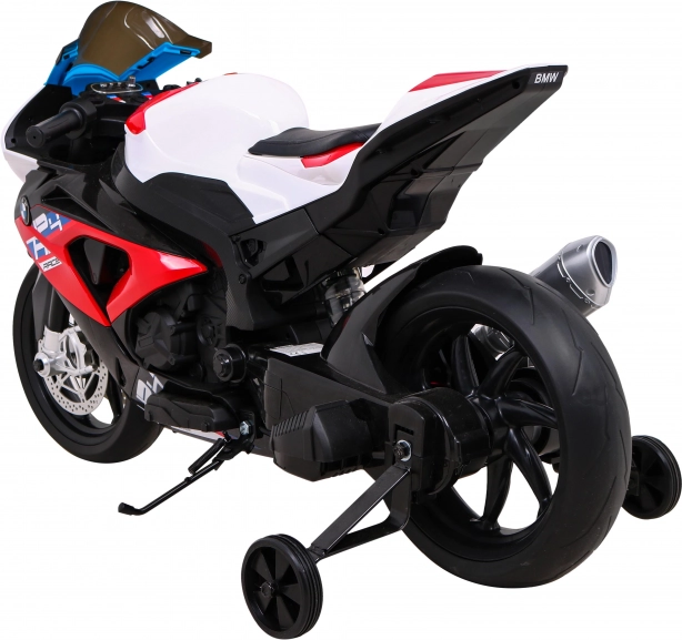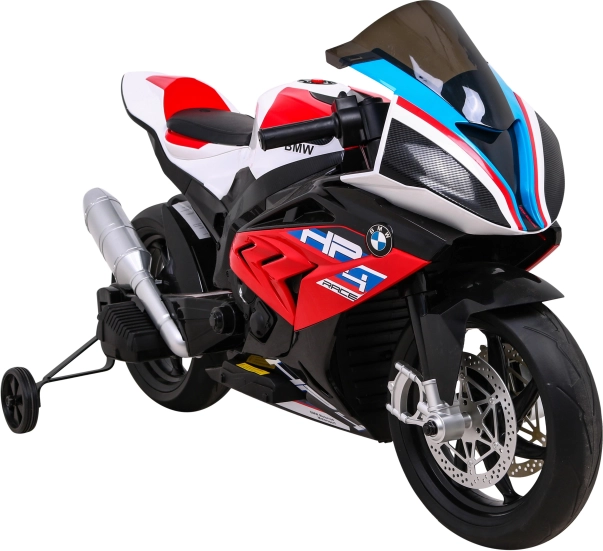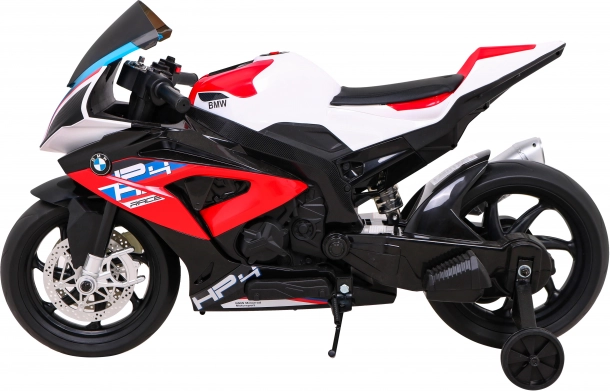 Dziecięcy motocykl elektryczny BMW HP4, czerwony z kółkami pomocniczymi, łagodny start, koła EVA i MP3 LED