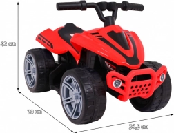 Siedzisko 24 × 13 cm oraz kompaktowy rozmiar pojazdu (70 × 38,5 × 42 cm) zapewniają wygodną i pewną pozycję podczas pierwszych jazd.