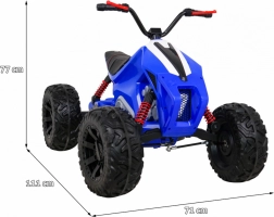 Przednie lampy LED zwiększają widoczność, a panel audio oferuje różne opcje odtwarzania muzyki — MP3, karty SD, AUX i USB. Zintegrowany wskaźnik naładowania baterii poinformuje, kiedy pora uzupełnić energię. Dzięki solidnej konstrukcji i maksymalnemu udźwigowi 25 kg ten quad to idealny towarzysz małych odkrywców.