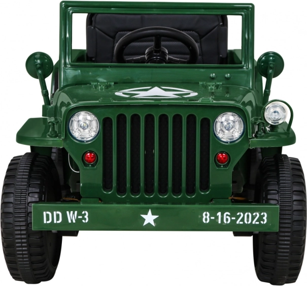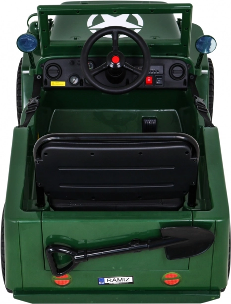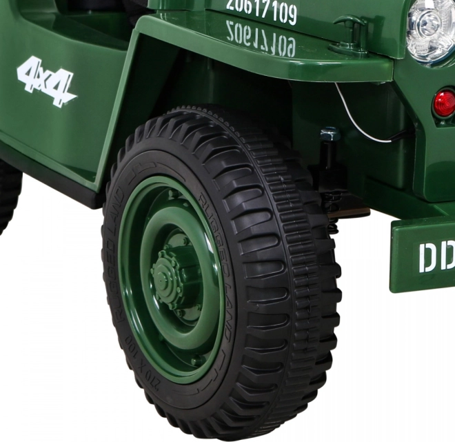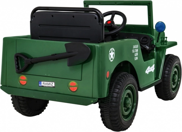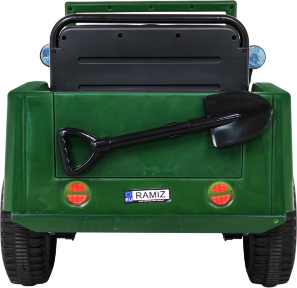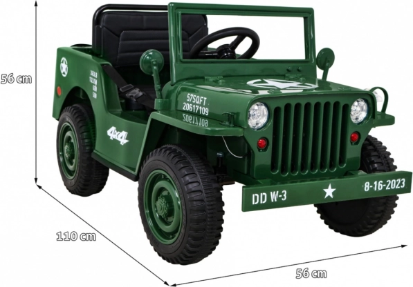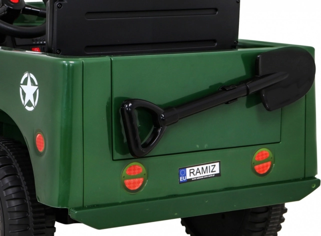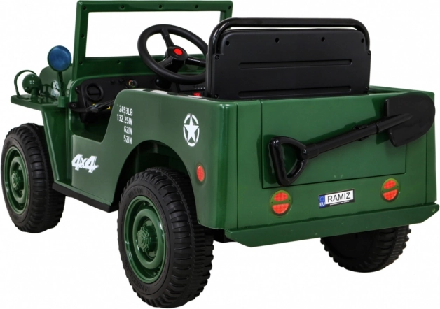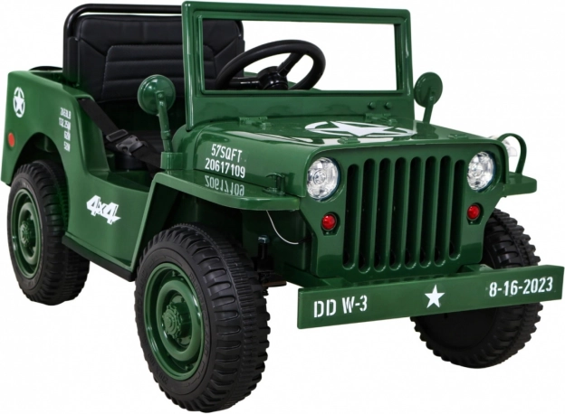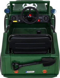 To zielone dziecięce autko w wojskowym retro stylu zachwyca realistycznymi detalami, bezpiecznym wyposażeniem i płynnym ruszaniem. Cztery silniki 35 W zapewniają niezawodny napęd, natomiast zawieszenie z przodu i z tyłu oraz piankowe koła EVA 26 × 9 cm gwarantują komfort na różnych nawierzchniach. Oświetlenie zapewniają przednie światła LED z własnym włącznikiem.