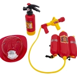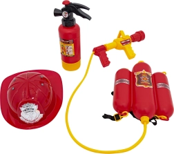 W zestawie znajduje się kask, wodna gaśnica oraz plecak z pryskaczem i zbiornikami – idealne do kreatywnych misji ratunkowych.