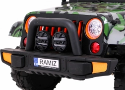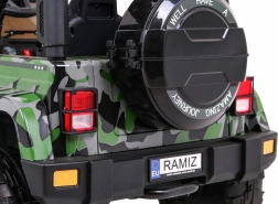 Solidny dziecięcy samochodzik elektryczny w designie terenowego 4x4 z lakierem moro zapewnia prawdziwą frajdę z jazdy. Wyposażony w 4 silniki, miękkie koła EVA z łożyskami, przednie i tylne oświetlenie LED oraz wygodne siedzenie z pięciopunktowymi pasami. Rodzice docenią zdalne sterowanie 2,4 GHz z przyciskiem STOP, a mali kierowcy bogaty panel audio (MP3, USB, SD, AUX).