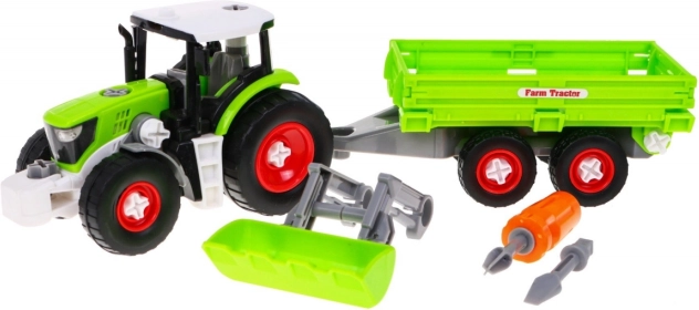 Traktor i przyczepę można łatwo rozłożyć i ponownie złożyć dzięki dołączonej wiertarce z dwiema końcówkami.