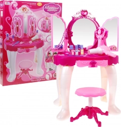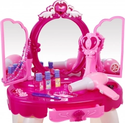 W zestawie znajduje się stabilny stolik, wygodne krzesełko oraz bogaty komplet dodatków do makijażu i ozdabiania. Działająca suszarka na baterie wydaje dźwięk i delikatny powiew, co dodaje zabawie realizmu. Zestaw wspiera kreatywność, motorykę małą i zabawy w odgrywanie ról.