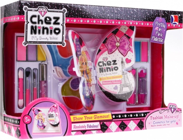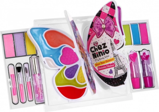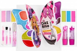 - etui w kształcie motyla; 2× pomadka; kolorowe błyszczyki do ust; kolorowe cienie do powiek; pędzelki; 2× lusterko