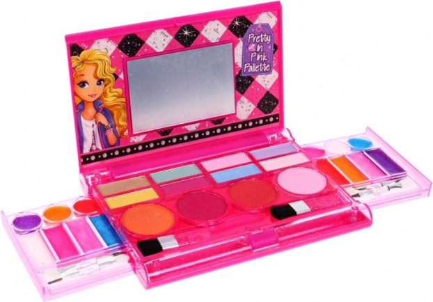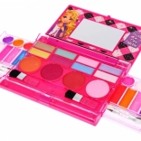 Paletka kryje wiele różnokolorowych cieni do powiek i pomadek, aplikatory/pędzelki oraz praktyczne lusterko. Dzięki sprytnej konstrukcji w kilka chwil rozłożysz ją do przejrzystej przestrzeni roboczej, a po skończeniu makijażu z łatwością zamkniesz.