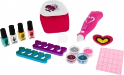 Wszystko, czego potrzeba do domowego nail art w jednym miejscu: lakiery, ozdoby, brokaty, separatory i pilnik. Praktyczna suszarka skraca czas oczekiwania i pomaga utrwalić zdobienia.