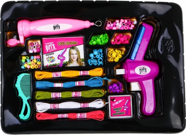 Kompletny zestaw do zdobienia włosów i wykonywania bransoletek oraz naszyjników – koraliki, kółeczka, literki, sznureczki, grzebyk i praktyczne narzędzia ułatwiające tworzenie.