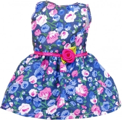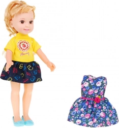 Lalka ma podstawowy komplet oraz dodatkowo kwiecistą sukienkę – dzieci mogą łączyć elementy według nastroju i historii.