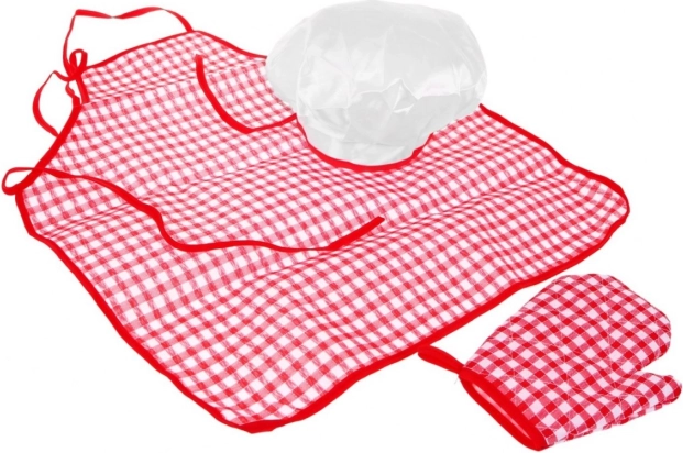 W zestawie znajduje się kostium obejmujący fartuch, czapkę i kuchenną rękawicę w czerwono-białą kratę – dzieci od razu poczują się jak prawdziwi szefowie kuchni.