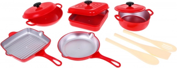 Wszystko, czego dzieci potrzebują: 2 garnki z pokrywkami, wok z pokrywką, 2 patelnie, 3 łyżki oraz zestaw kucharski. Zapakowane w poręczne pudełko – świetne również na prezent.