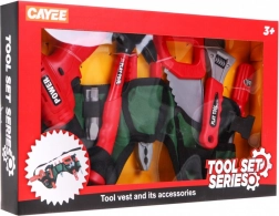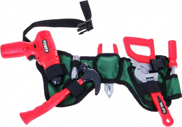 - Regulowany pas na narzędzia, wiertarka, 3 wymienne bity, śrubokręt, szczypce, klucz nastawny, piłka, młotek