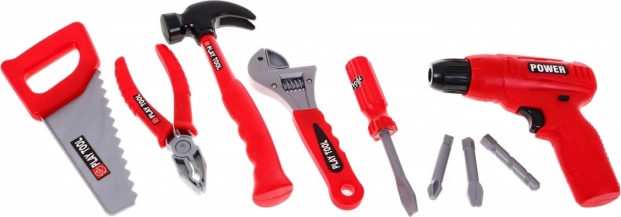 Młotek, piłka, śrubokręt, szczypce i klucz nastawny – wszystko z trwałego plastiku, by zapewnić bezpieczną i wciągającą zabawę w domu i w ogrodzie.