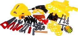 wkrętarko-wiertarka, młotek, imadło, piła, szczypce, 2 śrubokręty, 4 klucze, 16 śrub, 16 nakrętek/nasadek, 4 kołki, 6 haczyków, miarka, 3 koła zębate (1 duże, 2 małe), gogle ochronne, maska ochronna, kask, 3 drewniane elementy z gwintami, 8 płaskich elementów z otworami