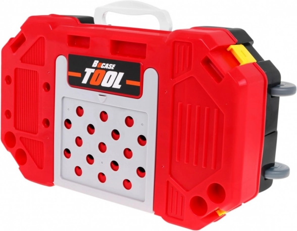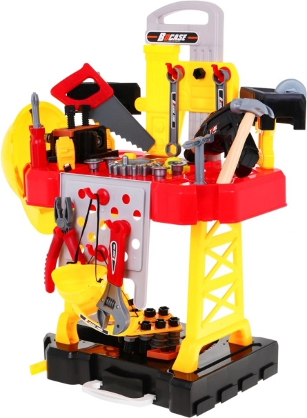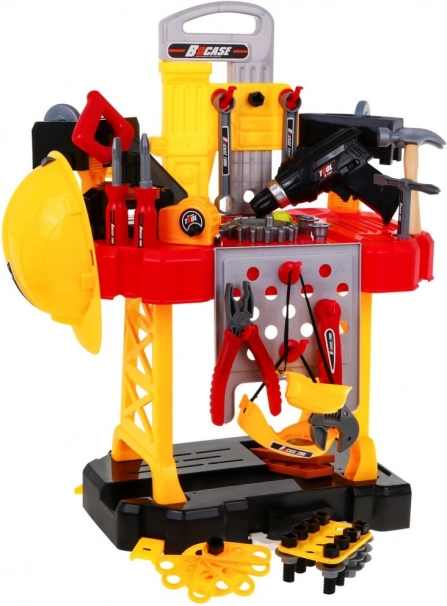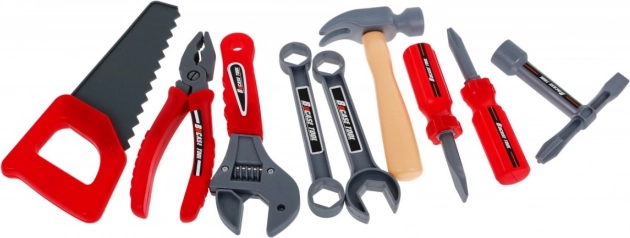 W zestawie bogate wyposażenie: wkrętarko-wiertarka, młotek, imadło, piła, szczypce, klucze imbusowe i płaskie, śrubokręty, śruby, nakrętki, koła zębate, miarka oraz elementy robocze z gwintami do nieskończonego wkręcania i montowania. Dzięki sprytnej organizacji narzędzi dzieci ćwiczą porządek, cierpliwość i koordynację ręka–oko.