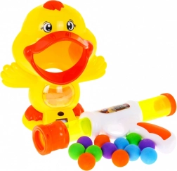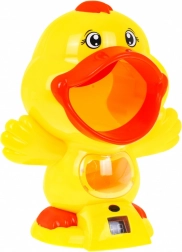 Uroczy cel w kształcie kaczki z otwartym dziobem zbiera kulki, po trafieniu reaguje dźwiękiem i ułatwia bieżące liczenie wyniku.