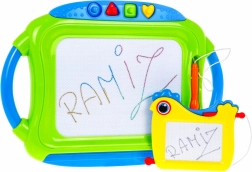 Ten zestaw zawiera dużą magnetyczną tablicę z wielobarwnym efektem rysowania i czterema stempelkami oraz mniejszą tabliczkę z jednokolorowym zapisem. Obie tablice mają przymocowane rysiki na sznureczku, więc się nie zgubią, a także praktyczny suwak do szybkiego kasowania rysunków.