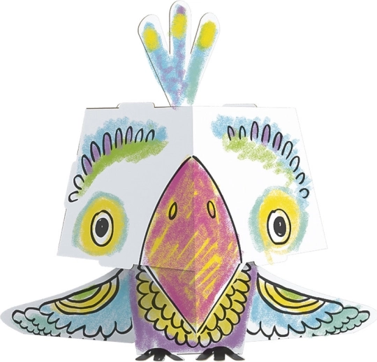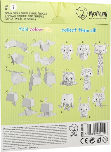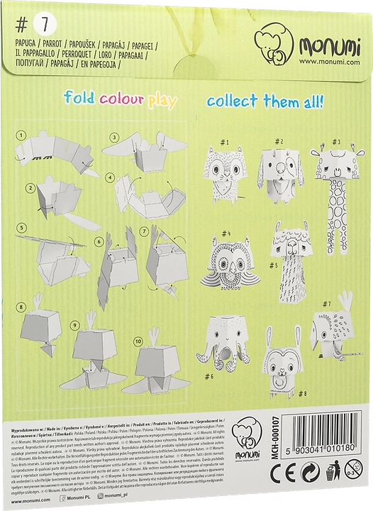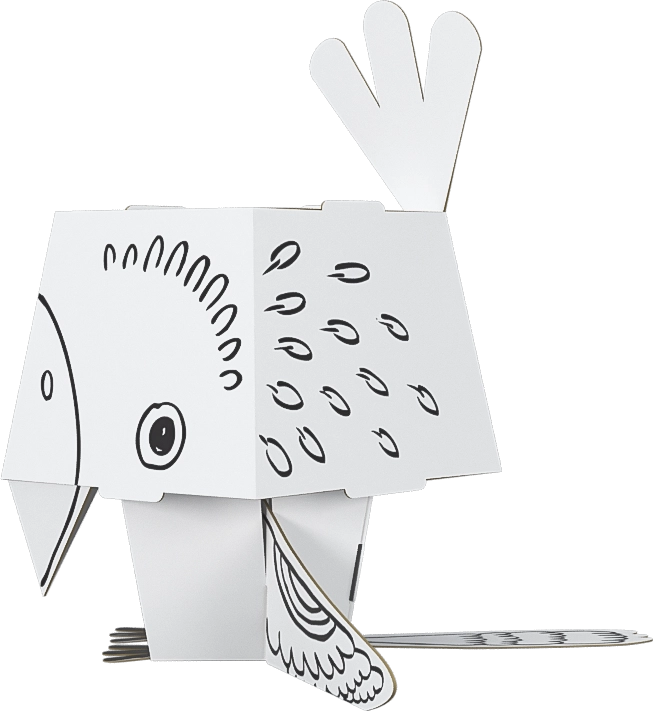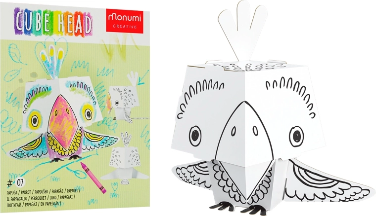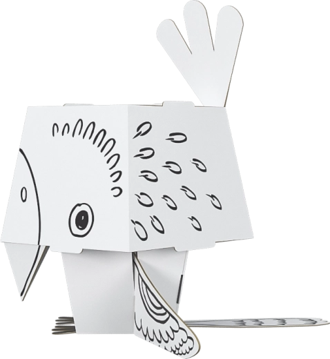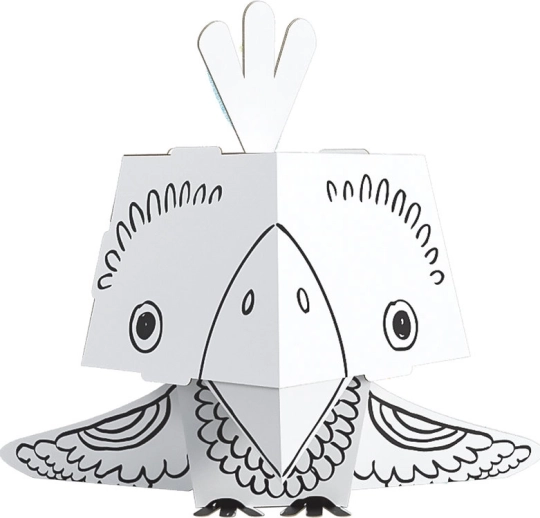 Ta kreatywna składanka daje dzieciom podwójną frajdę – najpierw kolorują papugę, a następnie składają ją w przestrzenny model z uroczo dużą głową. Profesjonalny czarny nadruk podkreśla kontury i ułatwia kolorowanie, karton świetnie chłonie kolor i nie faluje ani nie przebija.