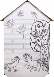 Białe ściany z czarnymi konturami koni zachęcają do malowania kredkami lub flamastrami. Dzieci tworzą niepowtarzalny wygląd domku i rozwijają wyobraźnię.