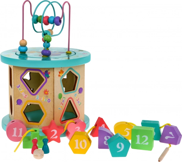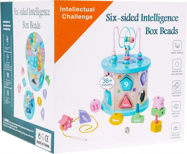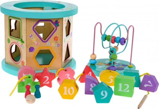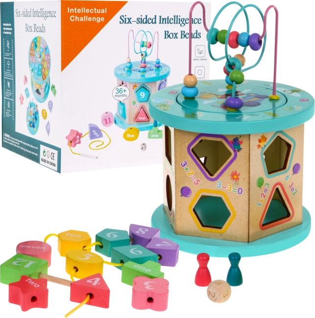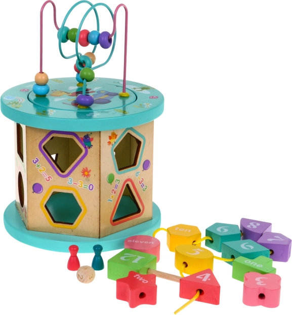 Ta drewniana multikostka oferuje kilka sposobów na zabawienie Twojego dziecka. Górna część kostki ma przeplatankę–labirynt do przesuwania kolorowych koralików, natomiast dolna część zawiera planszę do gry.