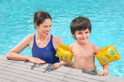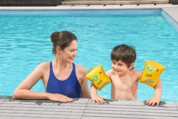 Dzięki kompaktowym wymiarom rękawki łatwo mieszczą się w torbie na basen i na wakacje. Zawór bezpieczeństwa zapobiega niechcianej ucieczce powietrza, a intensywna żółta barwa z motywem rybki zwiększa widoczność dziecka w wodzie.