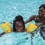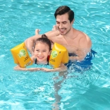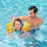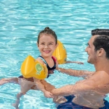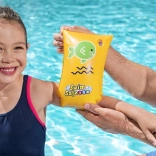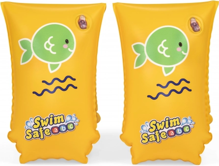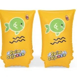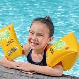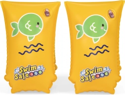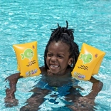 Jaskrawo żółte rękawki z zieloną rybką są dobrze widoczne i motywują dzieci do zabawy oraz nauki w wodzie.