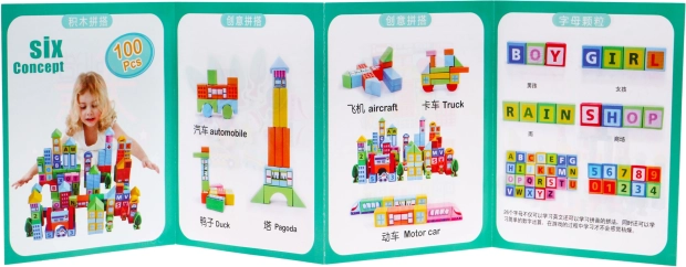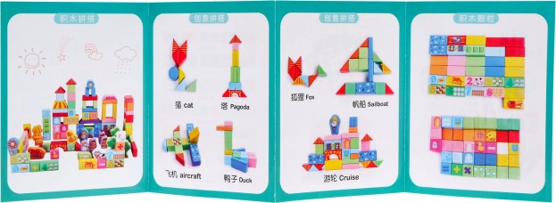 | - 100 drewnianych klocków w różnych kolorach i kształtach, - ilustrowana instrukcja. | |