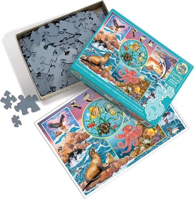 Ciesz się wspólnym układaniem z rodzinnymi puzzlami COBBLE HILL – Magia oceanu o 350 elementach. Unikalne opakowanie łączy trzy rozmiary elementów dla dzieci, rodziców i dziadków, dzięki czemu każdy znajdzie coś dla siebie. Specjalna nieregularna wykrawka zwiększa frajdę i wyzwanie, a hojny format 67,6 × 48,9 cm gwarantuje imponujący efekt końcowy.