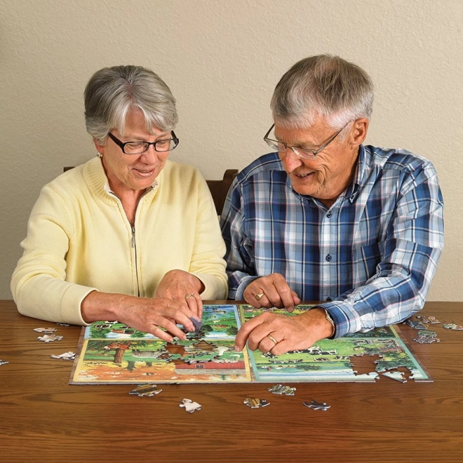 Puzzle COBBLE HILL „Przyjaciele ze wsi” oferują barwną i spokojną wiejską scenę ze zwierzętami i czerwonymi stodołami, która zachwyci miłośników natury. Ekstra duże elementy wygodnie leżą w dłoni i wspierają trening małej motoryki oraz percepcji przestrzennej.
