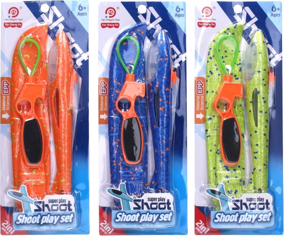 Wystrzeliwany samolot z efektami świetlnymi, długość 34 cm. 3× baterie AG3 w zestawie. 4 warianty kolorystyczne: niebieski, zielony, pomarańczowy, czerwony.