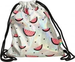 Błyszcząca srebrna powierzchnia z różowymi arbuzami i drobnymi serduszkami nadaje workowi oryginalny wygląd, który sprawdzi się w szkole i w mieście.