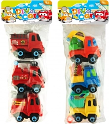 Zestaw samochodów do skręcania dla dzieci, zawierający trzy różne modele o długości 10 cm. Idealny dla małych budowniczych i strażaków.