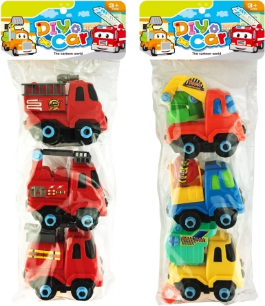 Zestaw samochodów do skręcania 3 szt. o długości 10 cm ze swobodnymi kołami, dostępny w wersji budowlanej i strażackiej.