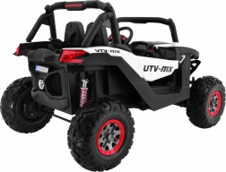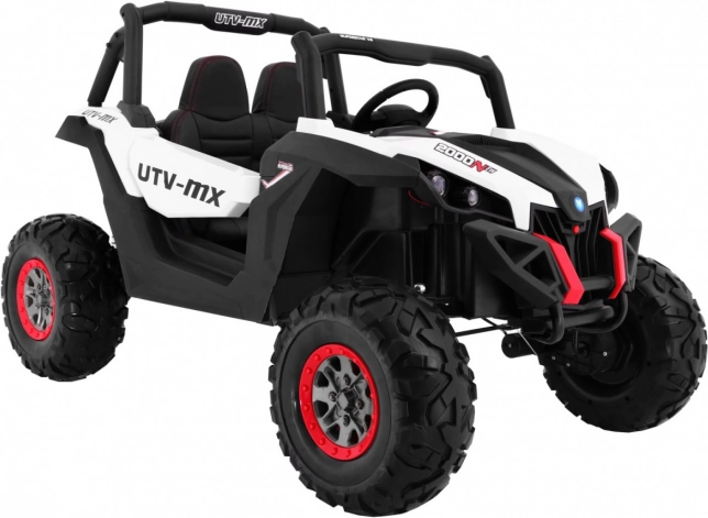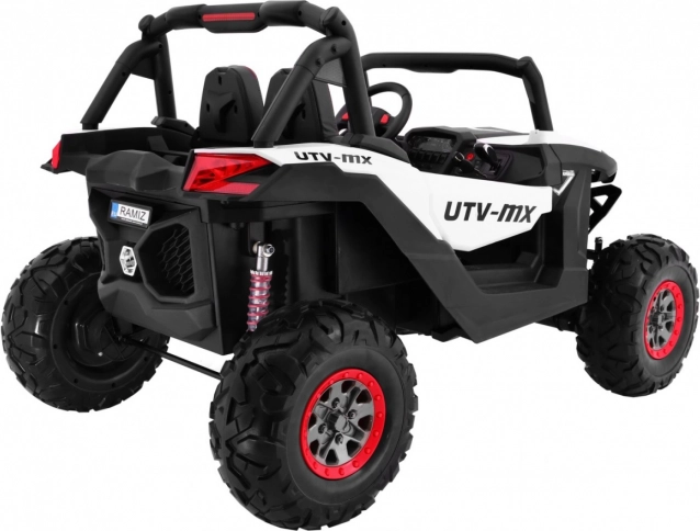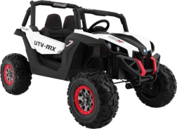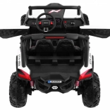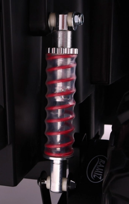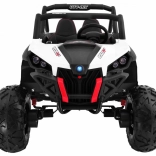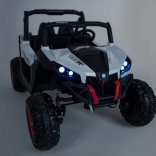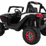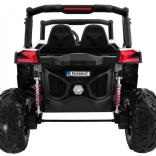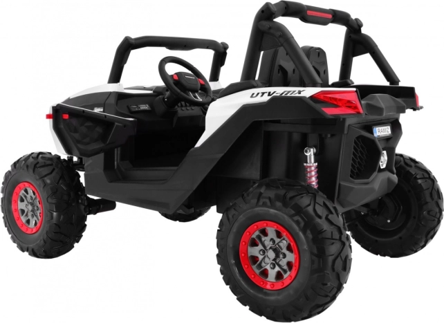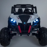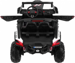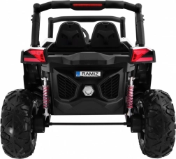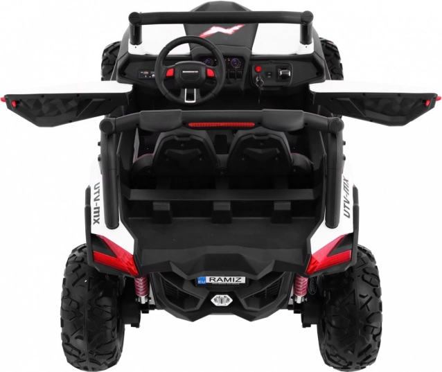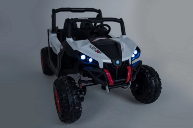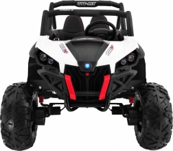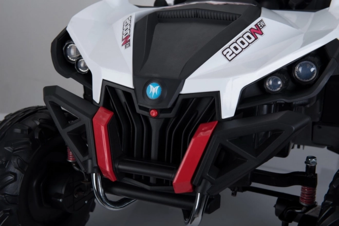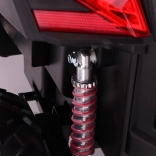 Buggy zostało zaprojektowane z myślą o stabilnej i komfortowej jeździe dzięki niezależnemu zawieszeniu (2× przód, 2× tył) z regulowanymi, gwintowanymi amortyzatorami. Duże koła EVA 35×15 cm świetnie tłumią nierówności, a wysoki prześwit 23 cm pomaga w jeździe poza utwardzonymi drogami. Podwójne siedzisko z czarnej wentylowanej ekoskóry z pasami zapewnia wygodę i bezpieczeństwo dla dwóch małych kierowców.