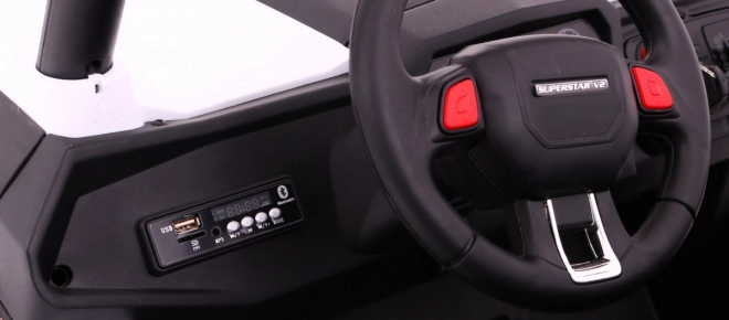 Panel multimedialny odtworzy ulubione utwory przez Bluetooth, USB, SD lub AUX. Dźwięki w kierownicy i światła LED dopełniają realistyczne wrażenia.