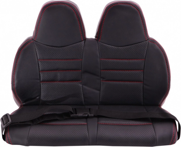 Podwójne siedzisko z wentylowanej ekoskóry z pasami, otwierane drzwi z blokadą oraz płynny start. Idealne na wygodne i bezpieczne przejażdżki.